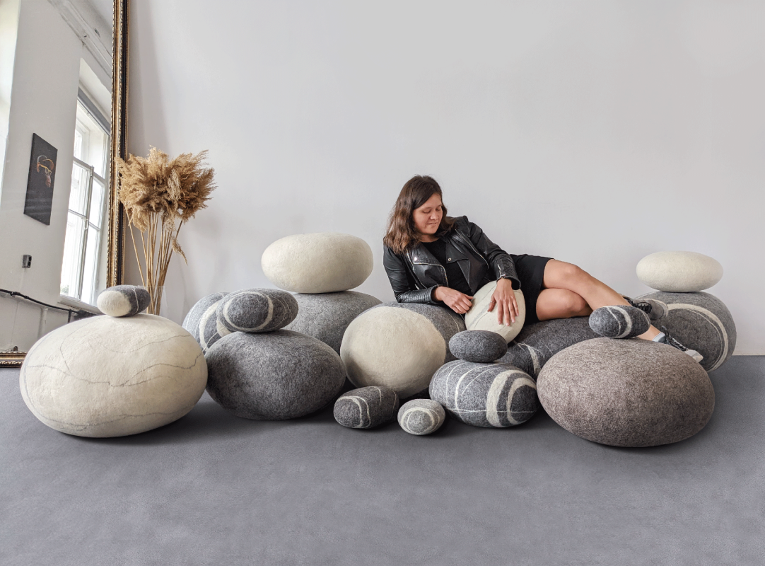 Natural felted wool. Soft stone-poufs. ”SET OF FOUR STONES #12”. Like real stones. KATSU is a wool cushions, pillows, ottomans and poufs.
