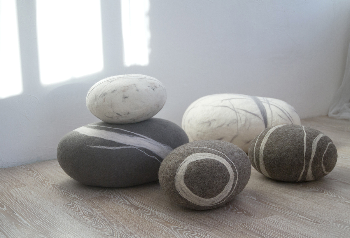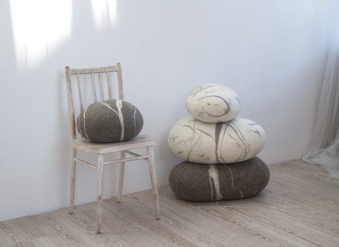 PILLOWS AND POUF-STONES are handmade from natural wool that preserves warmth. Seamless. Filled with Holofiber. Soft and Bouncy. Regain original shape easily. Streak patterns mirror nature itself, creating an illusion of real stone.