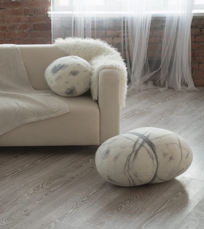 Natural felted wool. Soft stone-pouf. Model *White Stone*. Like real rocks and stones. KATSU is a wool ottomans, pillows, cushions and poufs